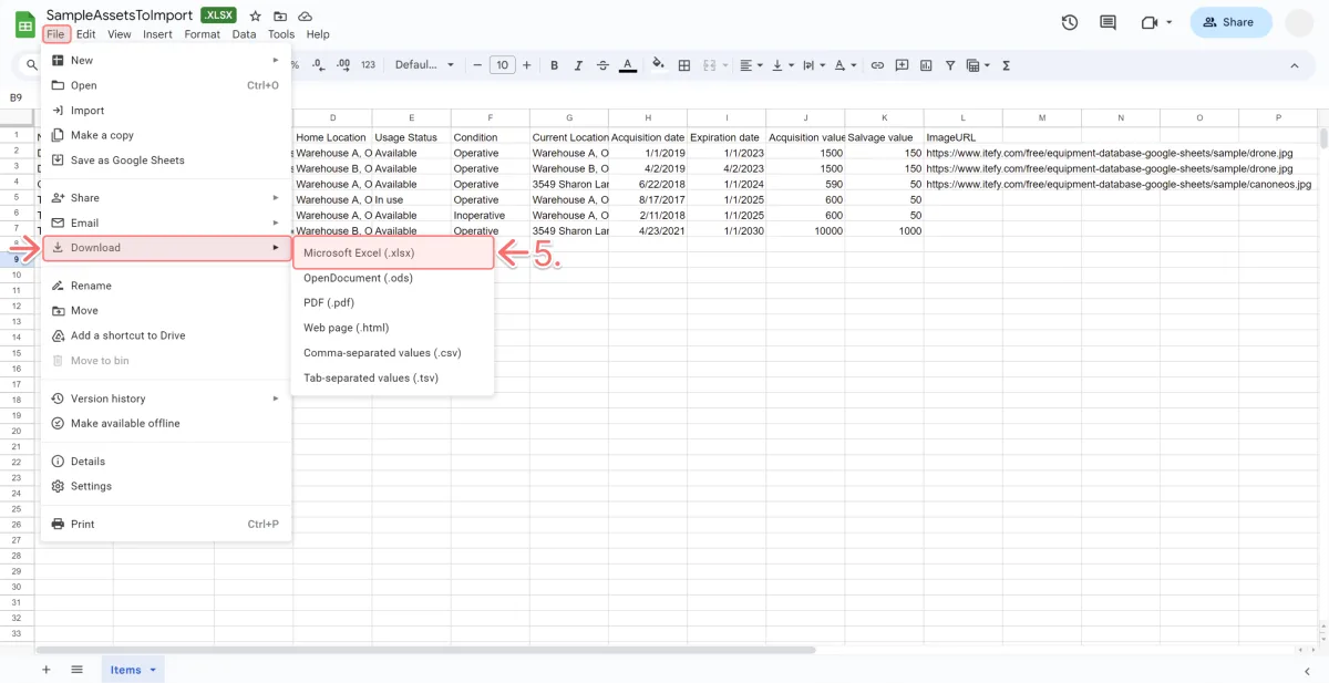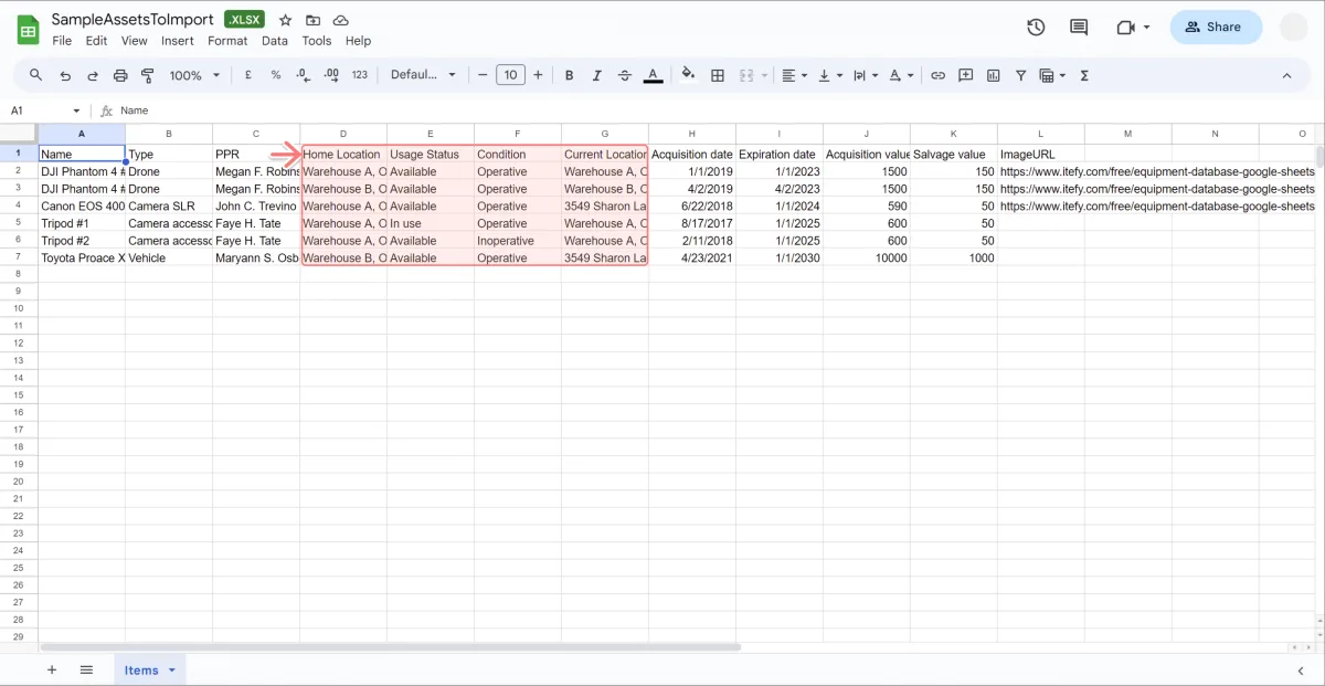- Download the spreadsheet SampleAssetsToImport.xlsx